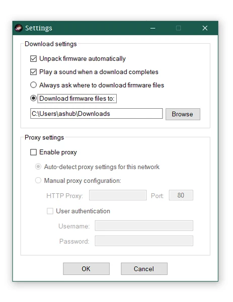 下载选项– 它允许用户选择要下载固件的文件夹。用户还可以选择下载不同地区的固件。