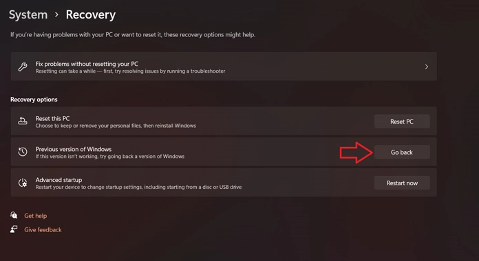 - 现在,您将找到返回到以前版本的 Windows 的选项。