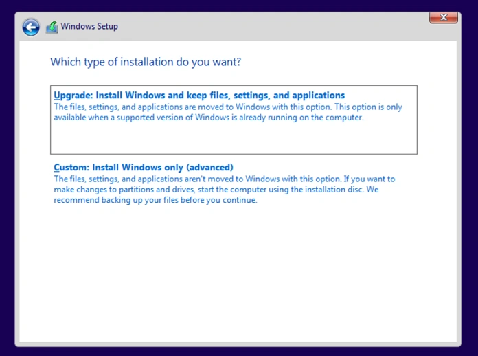- 接下来,它会询问您是否要执行全新安装或自定义安装。选择适合您的一款。