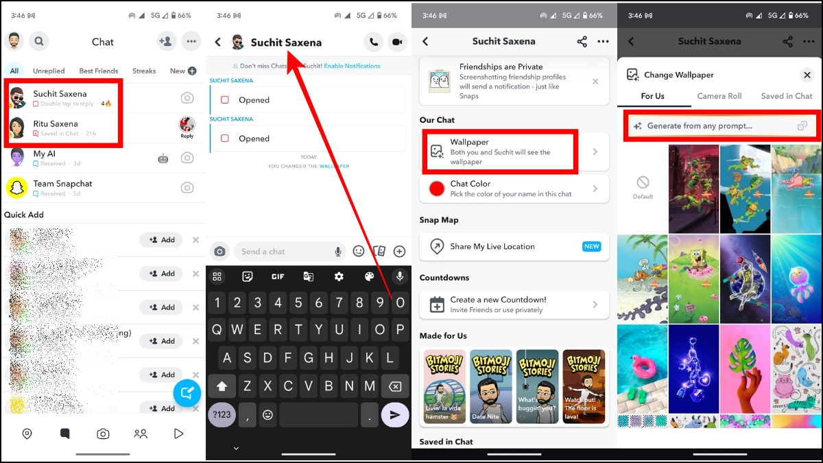 第5步:接下来,单击墙纸在我们的聊天部分下。或者,导航到您的个人资料,点击快照+,然后单击聊天壁纸并打开聊天。