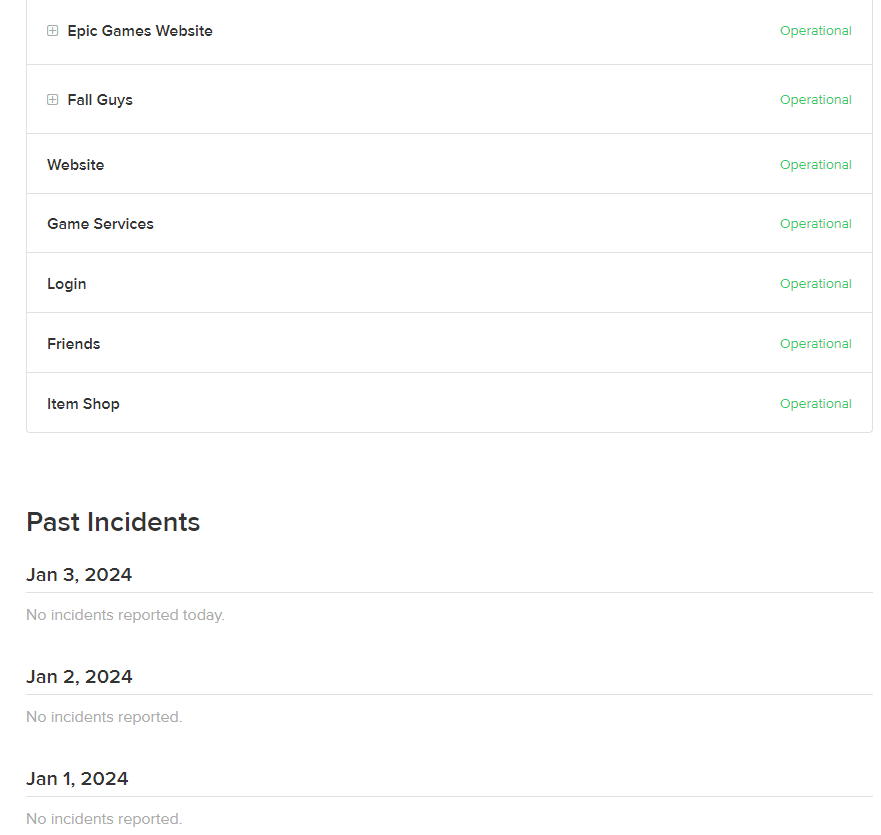 如果 Epic Games 启动器无法打开,您可以查看 Epic Games 服务器的运行情况。去他们特别的状态网页,它告诉您 Epic Games Store、Epic Online Services 和游戏服务是否正常工作。如果您的游戏启动器因问题或系统故障而出现问题,他们可能会在处理服务器问题后修复它。