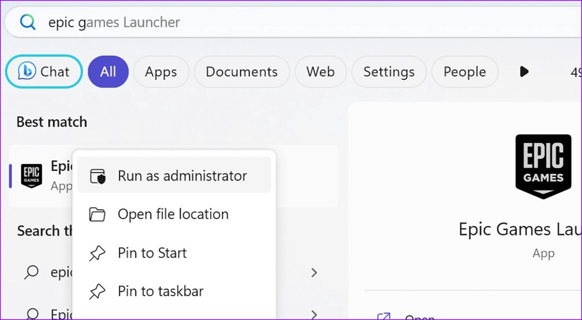 以管理员身份启动 Epic Games,以解决 Epic Games 启动器无法工作或无法打开的问题。只需在搜索框中找到 Epic Games,右键单击在应用程序名称上,然后选择以管理员身份打开它。