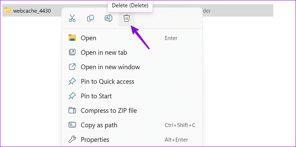 步骤 4。右键单击网络缓存文件夹并选择删除。