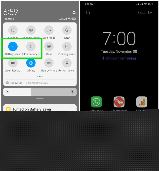 从屏幕顶部向下滑动以打开快速设置菜单,您将在此处找到省电模式和超级省电模式。超级省电模式严重限制了应用程序和手机功能,只有通话和消息会实时更新。我建议您在日常使用中仅启用基本省电模式。