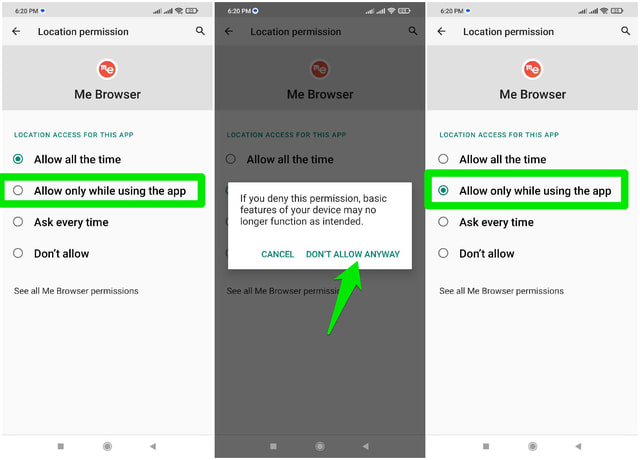 如果有您并不总是依赖的应用程序,只需点击它们并设置权限即可“仅在使用应用程序时允许”。将出现一条警告消息,告诉您这可能会影响您的设备功能,接受它并且权限将会更改。
