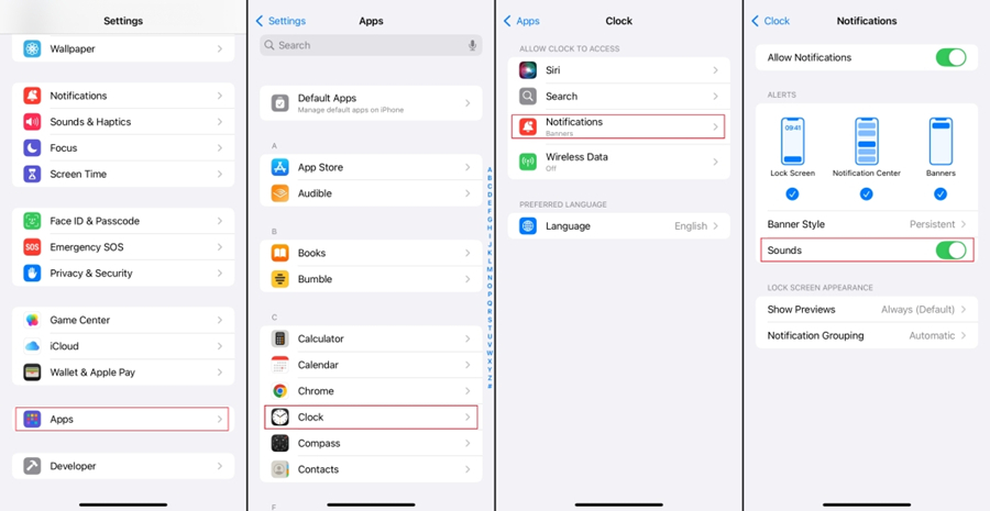 时钟通知也是影响 iPhone 闹钟声音的常见因素。如果您关闭时钟的通知声音,您的闹钟也不会响起。