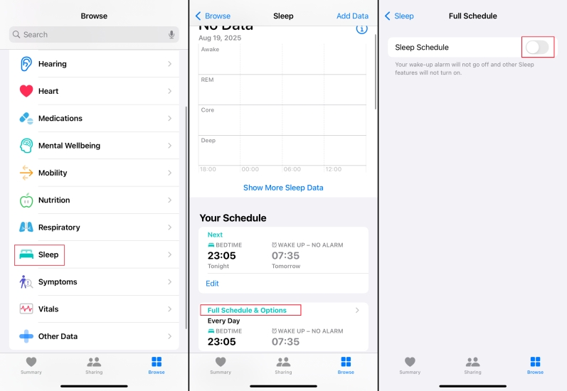 步骤1。前往健康 > 浏览 > 睡眠 > 完整时间表。