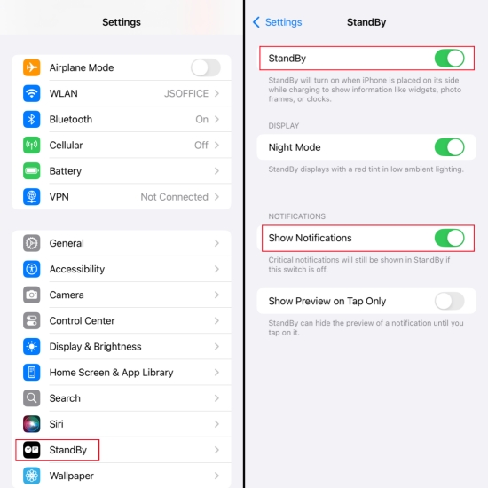 步骤2。禁用待机或打开显示通知并检查闹钟是否恢复正常。