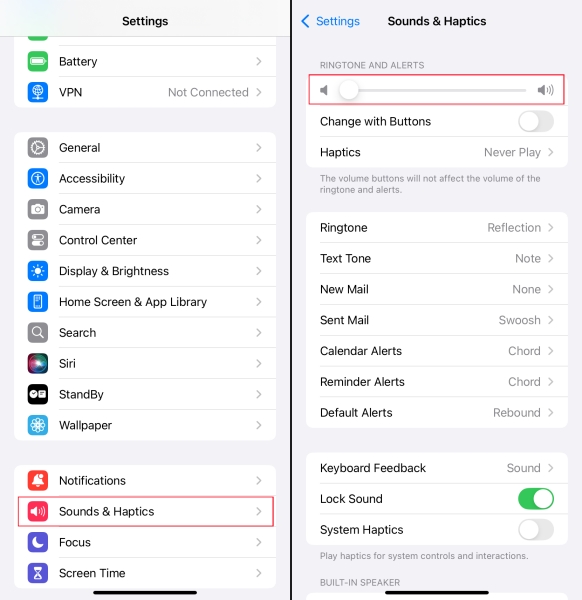 步骤2。拖动铃声和提醒按钮设置适合您的音量。