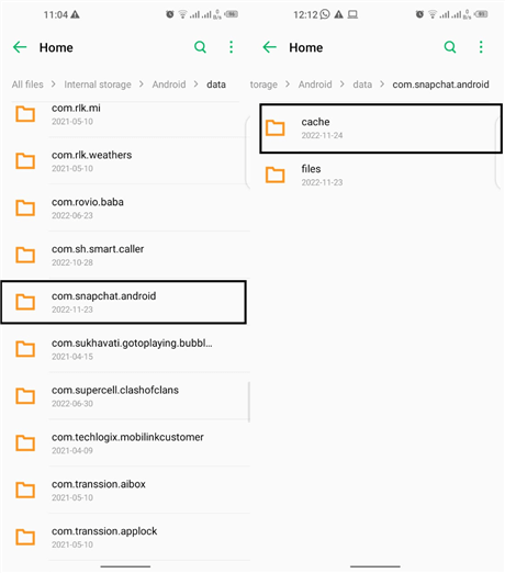 步骤 2. 在这里,您将找到所有应用程序的已保存数据。您的工作是向下滚动并查找名为“com.snapchat.android”的文件夹并将其打开。如果已删除的 Snapchat 消息仍然存储,那么您将看到一个“缓存”文件夹。