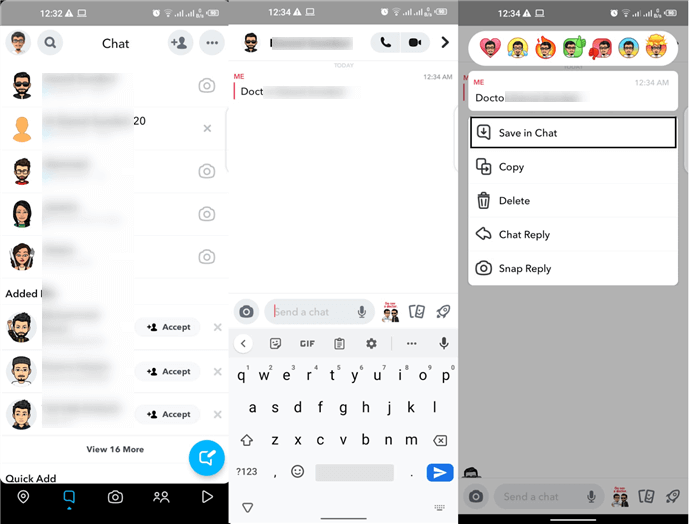步骤1.首先,打开Snapchat并从底部栏转到“聊天”部分。您也可以向右滚动查看它。当您打开所需的聊天时,发送一条消息。