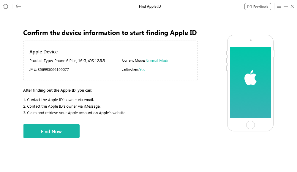 步骤2。将iPhone连接到电脑,然后您需要仔细阅读“使用条款”。当您看到越狱状态为“是”时,请单击立即查找按钮查找您的 Apple ID 地址或 iCloud 电子邮件地址。