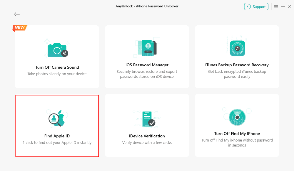 步骤1。免费下载 AnyUnlock 并将其安装到您的 PC 中并启动它。单击查找苹果 ID。
