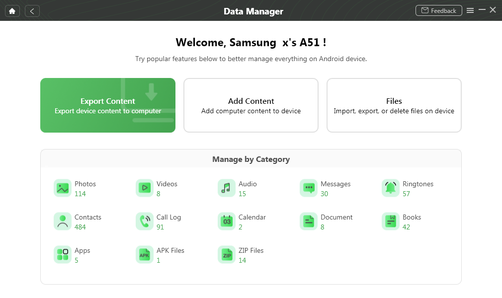 步骤 3. 选择导出内容模式并访问显示三星设备上的特定数据的界面。现在,您可以预览并有选择地将三星手机备份到电脑。