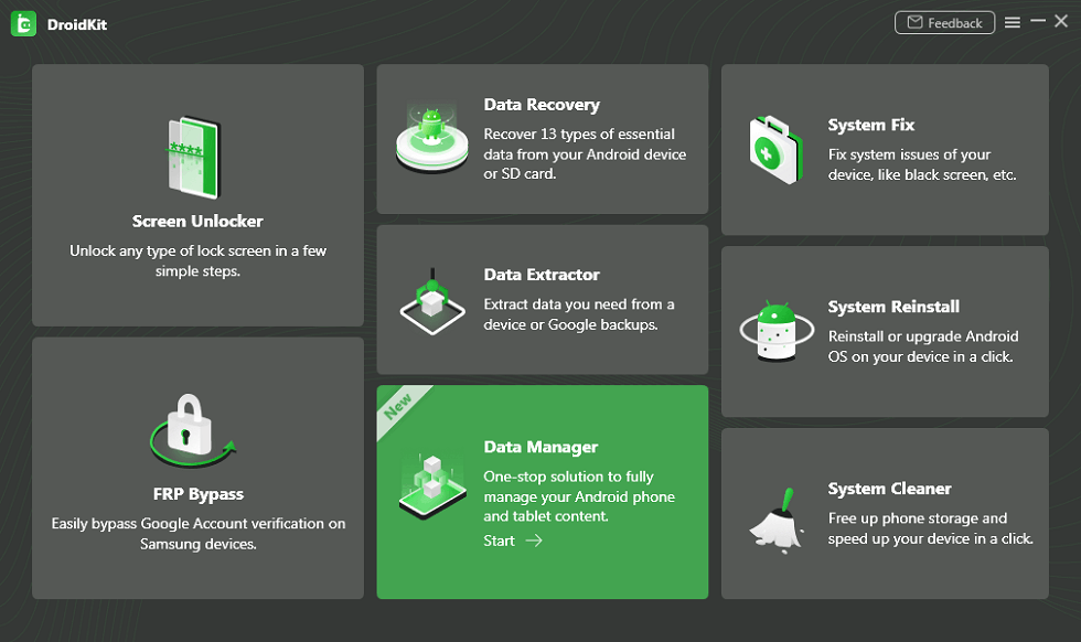 步骤1。 启动程序后 已安装 DroidKit 在您的计算机上 > 选择 数据管理器 模式。