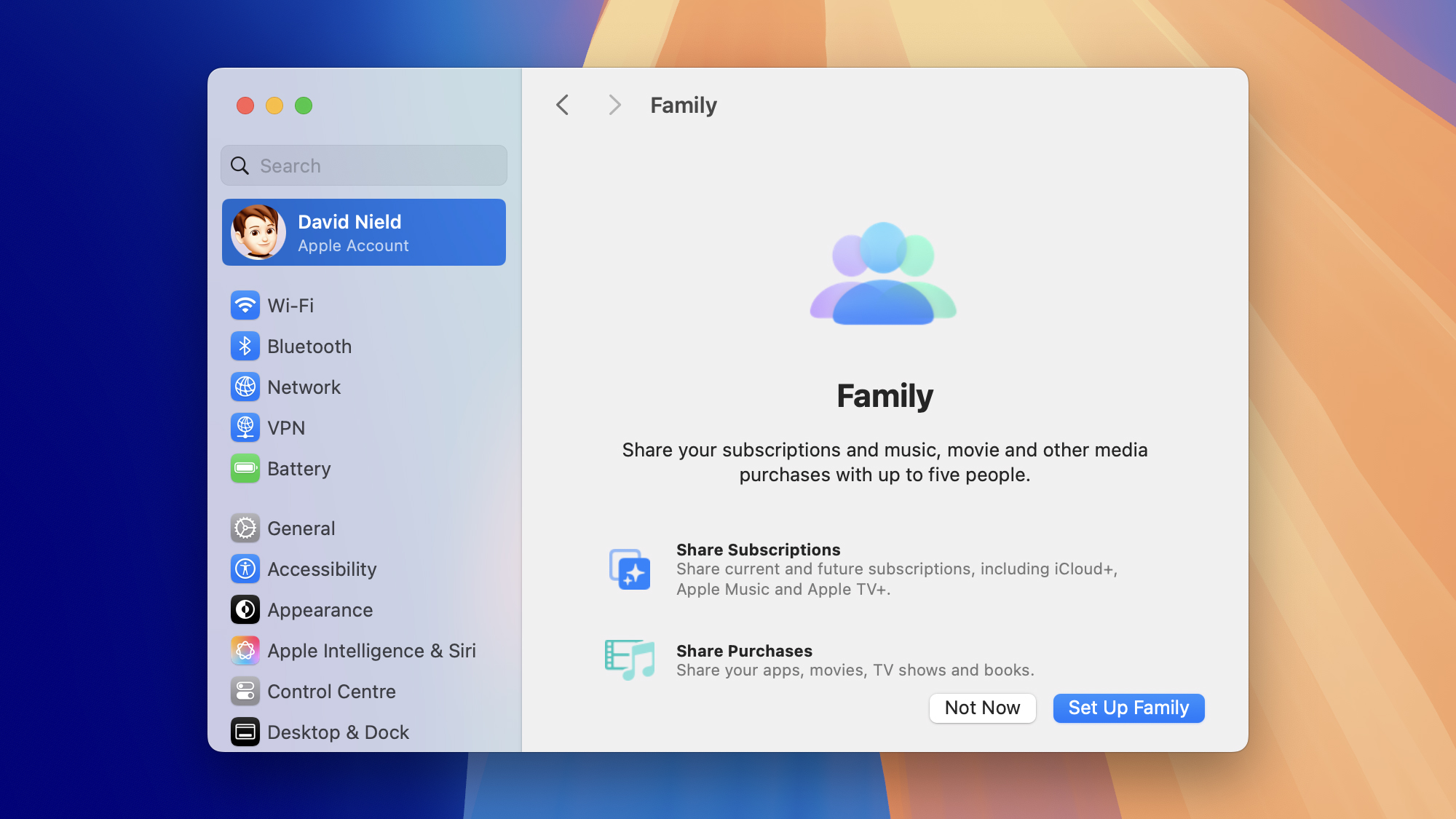 要设置家人共享,请在“设置”(iOS 和 iPadOS)或“系统设置”(macOS) 中选择您的帐户名称,然后选择家庭并按照说明进行操作。其他订阅,例如 Apple Music,也可以在家庭成员之间共享。