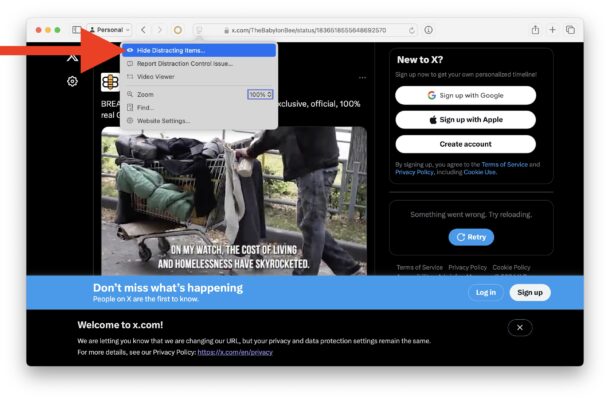 您可以在任何网页上从 Safari 访问分心控制,方法是单击 URL 状态栏中的“阅读器/选项”按钮,然后选择“隐藏分心项目”,然后选择屏幕上要隐藏的分心内容。