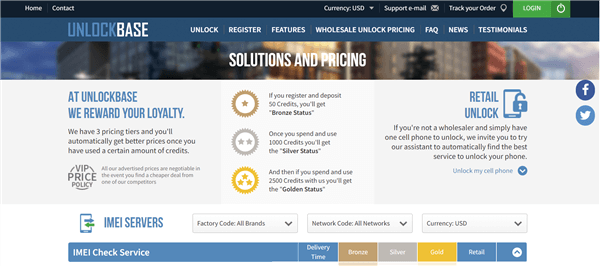 另一种最好的运营商解锁服务是 Unlock Base。几乎所有 Android 和 iPhone 手机都可以使用此运营商解锁服务进行解锁。它也非常快速且值得信赖。不过,这项服务最好的部分是,您在购买之前就可以真正知道解锁手机的费用。要使用该服务,请浏览主屋,请务必查看表格,了解解锁您的设备需要多长时间以及需要多少费用。如果你认为这两个估计都是合理的。从主菜单中,单击“解锁”,然后选择您的设备。