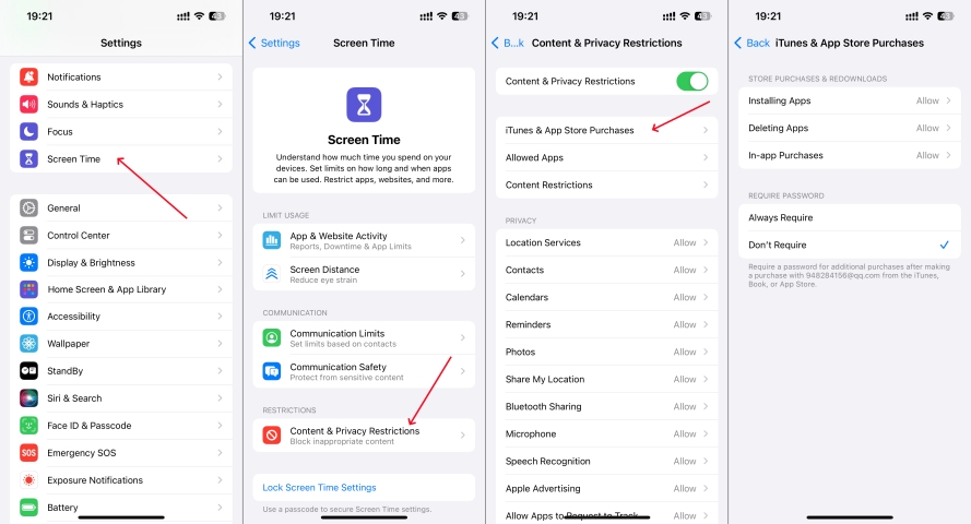 步骤3。点击iTunes 和 App Store 购买。接下来,允许安装、删除和应用内购买选项。