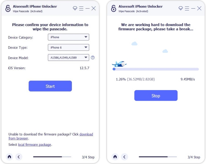 解锁前请确认您的设备信息,点击开始按钮,然后下载必要的固件来擦除密码。