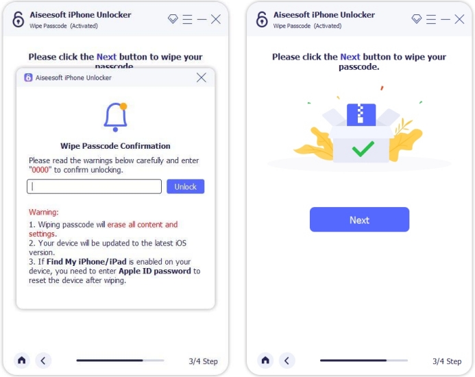 阅读屏幕上的警告,输入“0000”确认,然后单击开锁按钮开始解锁过程。