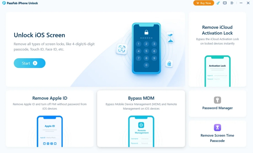 PassFab iPhone 解锁器是iPhone解锁领域的另一个强有力的竞争对手。它提供跨多种 iOS 锁类型的深入功能,并与最新的 iOS 版本兼容。由于其最小的设置,它特别适合不懂技术的用户。