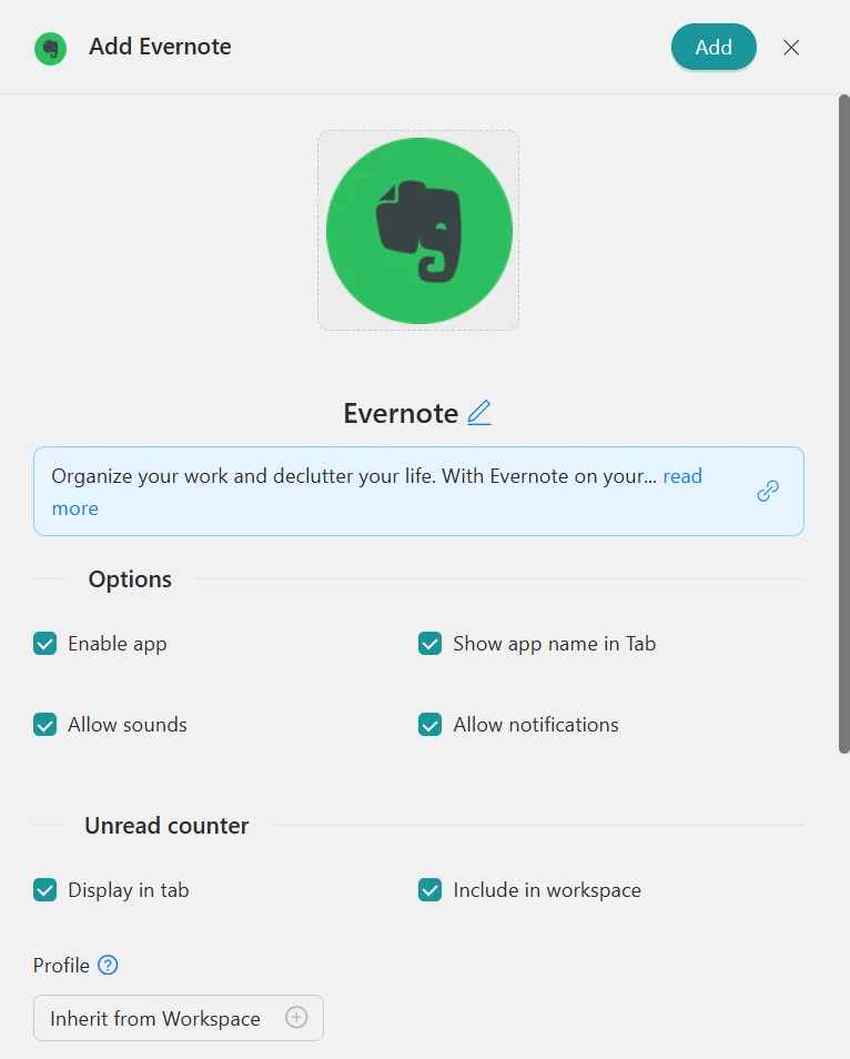 - 点击“添加”,就完成了!您的应用程序现在是 Rambox 工作区的一部分。就这么简单!