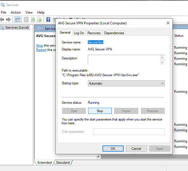 - 找到 AVG Secure VPN 并双击打开“属性”。