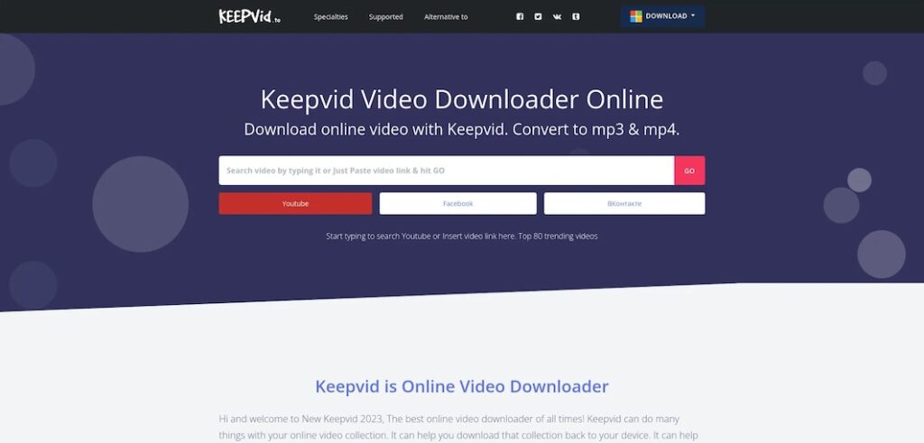 保持视频是一款用户友好的工具,支持 1,000 多个视频共享网站,使其成为希望从不太常见的平台下载的用户最通用的选择之一。下载过程得到简化:只需粘贴链接,选择格式和质量,然后下载。