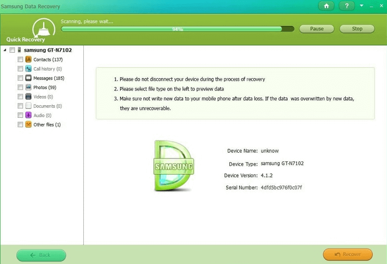 如果您使用三星设备,三星数据恢复是最领先、最强大的 Android 数据恢复程序之一,无需 root,它可以扫描和恢复三星设备上的文件。此 Android 数据恢复工具支持多达 8 种文件格式,涉及多种扩展类型。