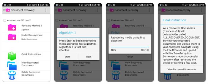 如果您的文件被删除,那么您也可以尝试Document Recovery来恢复已删除的文件Android无需root。顾名思义,该工具主要用于恢复文档,因此您可以尝试使用它来恢复丢失的任何重要文档。但如果是恢复照片和视频,您就必须考虑其他工具。不管怎样,它仍然是一款值得尝试的Android恢复工具。