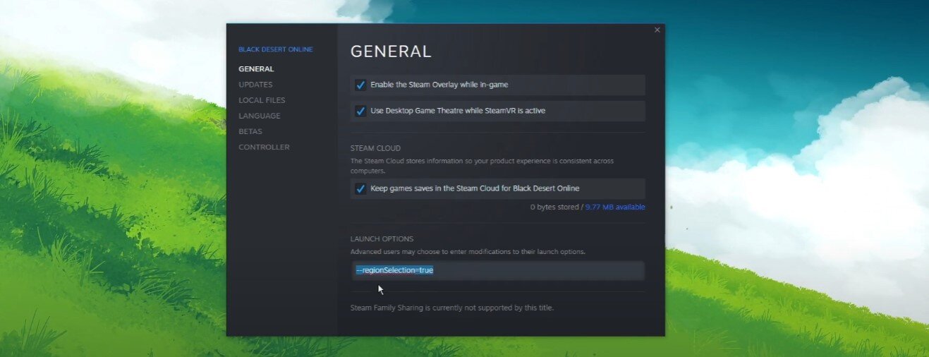 关闭黑色沙漠 Online 并打开您的 Steam 库。右键单击《黑色沙漠 Online》并导航至游戏属性。在“常规”选项卡中,您可以在窗口上添加启动选项。这些命令将在您每次启动游戏时应用。