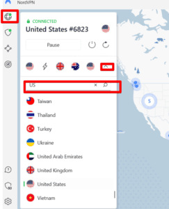 - 点击地球图标并点击“快速连接” 自动连接到最快的可用 NordVPN 服务器。或者,单击倒置插入符号和搜索您首选的服务器位置从搜索栏。