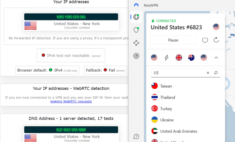 - 进行IP/DNS泄漏测试确认您的连接位于基于 #step 6 中所选服务器的 VPN 分配的 IP 地址上。