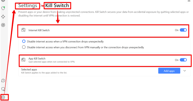- 启用终止开关防止 VPN 突然断开时 IP 泄露。前往设置>终止开关>互联网终止开关。