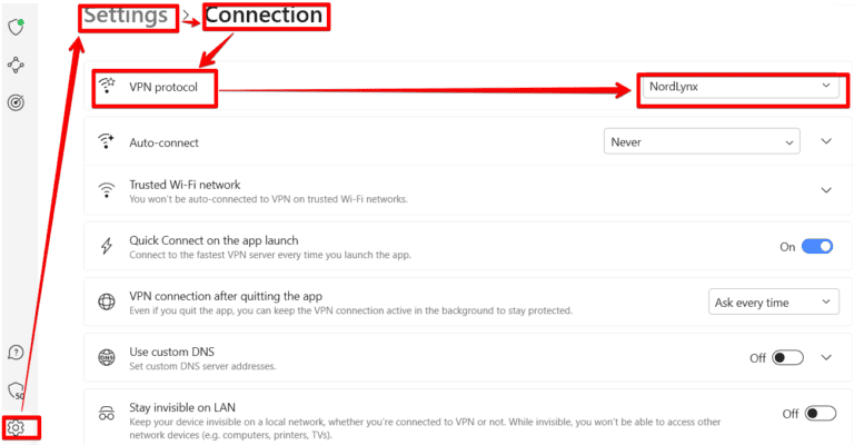 - 选择合适的VPN协议,优选地北山猫,因为它平衡了连接速度和安全性。前往设置>联系>VPN协议>北山猫。