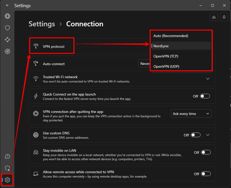 - 连接到适当的 NordVPN 协议。我推荐 NordLynx 协议,因为它在速度和安全性方面具有出色的平衡。前往设置>联系>VPN协议并选择 NordLynx。