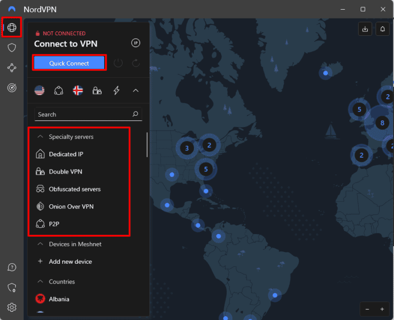 - 连接到适当的 NordVPN 服务器位置。单击地球图标>快速连接寻找您所在位置附近最好的服务器。或者,连接到专用服务器(P2P、专用 IP)以避免 VPN IP 禁令或改善多人游戏访问。