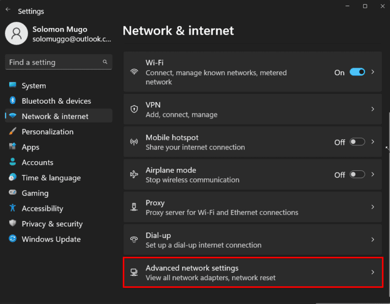 - 点击 ”高级网络设置”。