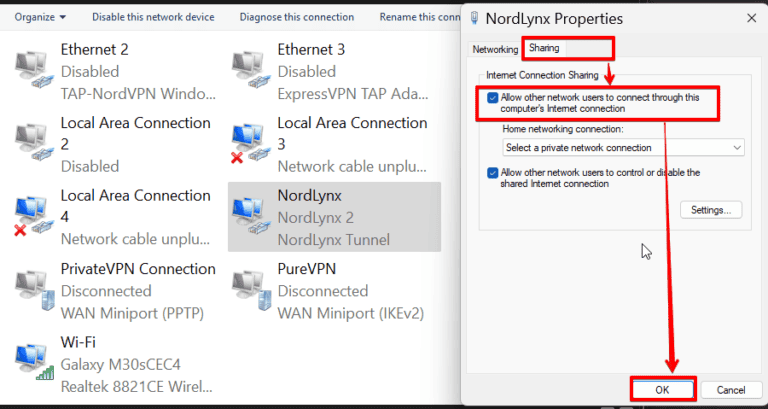 - 在下面 ”分享,“ 打钩 ”允许其他网络用户通过此计算机的 Internet 连接进行连接”并点击“好的”。