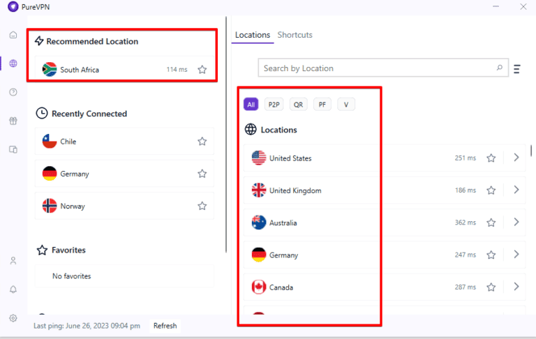 - 连接到附近的 PureVPN 服务器,以获得快速、无延迟的 FFXIV 体验。穿过地球图标>推荐地点为最低 ping 服务器靠近您的位置。
