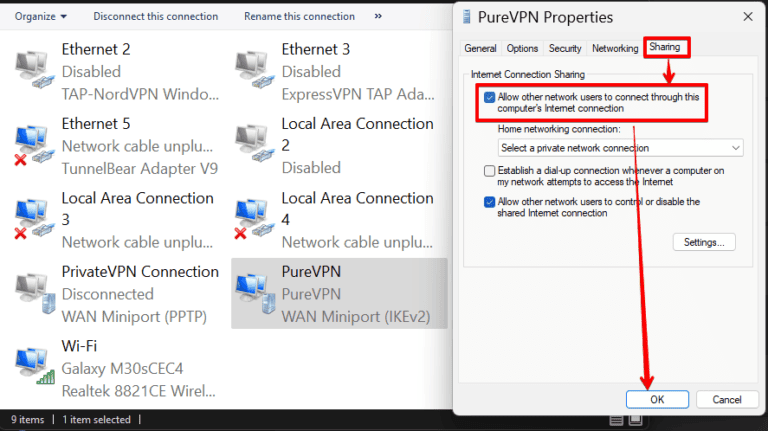 - 在下面 ”分享,“ 打钩 ”允许其他网络用户通过此计算机的 Internet 连接进行连接”并点击“好的”。