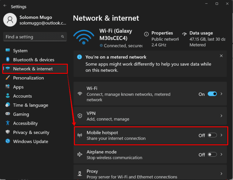 - 前往设置>网络与互联网>移动热点在您的电脑上。