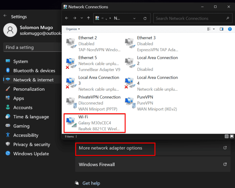 - 点击 ”更多网络适配器选项”并确保“下绿灯”无线上网” 已开启。