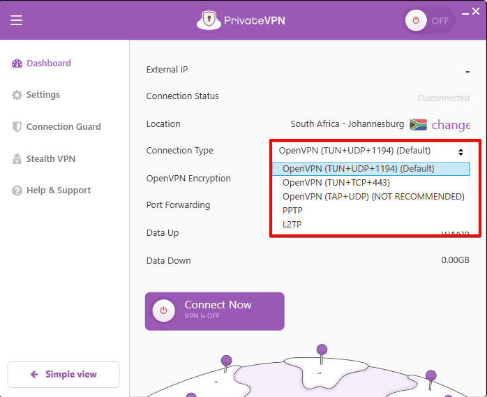 - 连接到适当的 PrivateVPN 协议。我推荐默认的 OpenVPN 协议。前往仪表板>连接类型>选择OpenVPN (TUN+UDP+11194)(默认)。