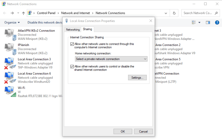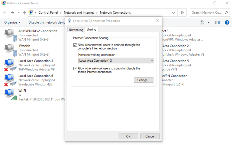 - 选择“分享“选项卡并检查”允许其他网络用户通过此计算机的 Internet 连接进行连接”。