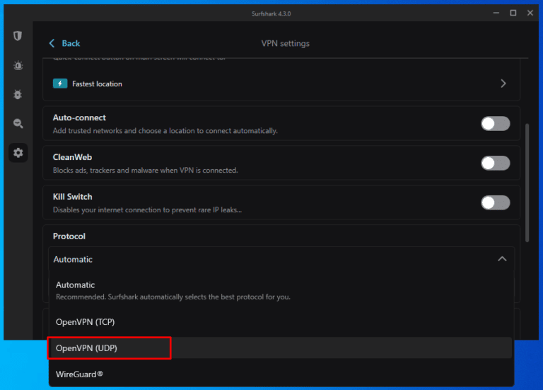 - 打开冲浪鲨, 前往设置>VPN 设置,并将协议更改为OpenVPN UDP。