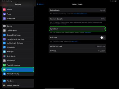 在 Apple 2024 年 M4 iPad Pro 和 M2 iPad Air 型号上,Apple 可以检查已完成的电池周期数,这是确定设备电池状况的重要指标。