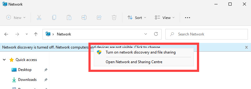 从桌面打开文件资源管理器,您将在左下角看到一个网络链接。单击此按钮,将出现一个横幅,告诉您网络发现已关闭并且网络计算机当前不可见。