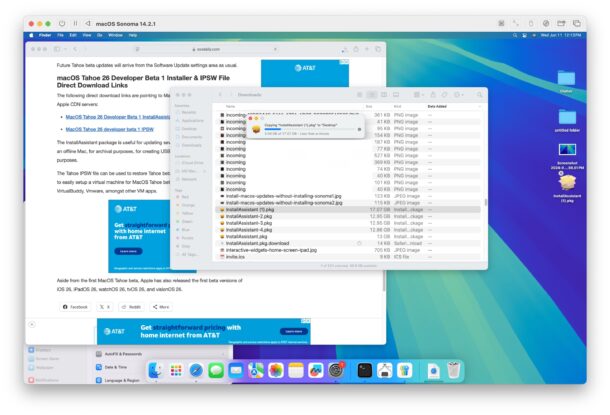 在此处的屏幕截图示例中,MacOS Tahoe 的完整软件包安装程序正在从本地主机 Mac 复制到 MacOS Sonoma 虚拟机中,以便可以轻松地将虚拟机升级到 MacOS Tahoe。虚拟化 MacOS 提供了一种在受控环境中测试新操作系统的好方法,而无需用有缺陷的 beta 版本替换稳定的 MacOS 版本。